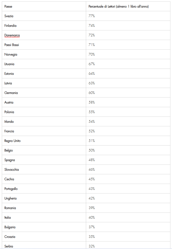Nel complesso, il 48% della popolazione europea ( dai 15 anni) ha dichiarato di aver letto almeno un libro nell’ultimo anno, con i paesi scandinavi, come la Svezia e la Finlandia, che vantano le percentuali più alte di lettori, superiori al 70%. Al contrario, i dati evidenziano che paesi come la Bulgaria, la Romania e l’Italia mostrano percentuali di lettura significativamente inferiori, con un divario che non accenna a ridursi.